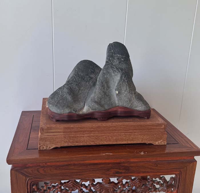 一、石种与产地 石种:灵璧石·青黛灵璧磬石;出自安徽灵璧渔沟镇老坑,为距今七亿年震旦纪海相硅质灰岩,含绢云母、微晶石英,质地缜密,叩之清越若编磬,乃灵璧石中可制“山子小品”之上品。 二、题名与