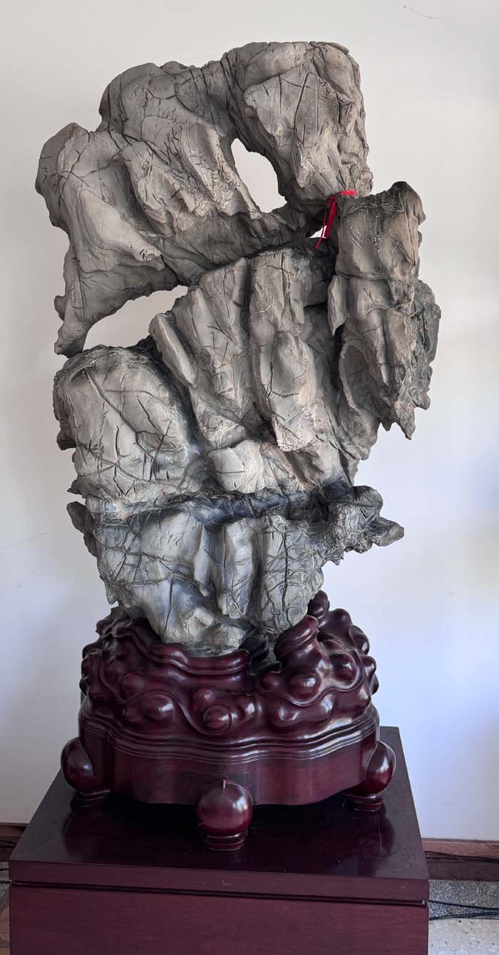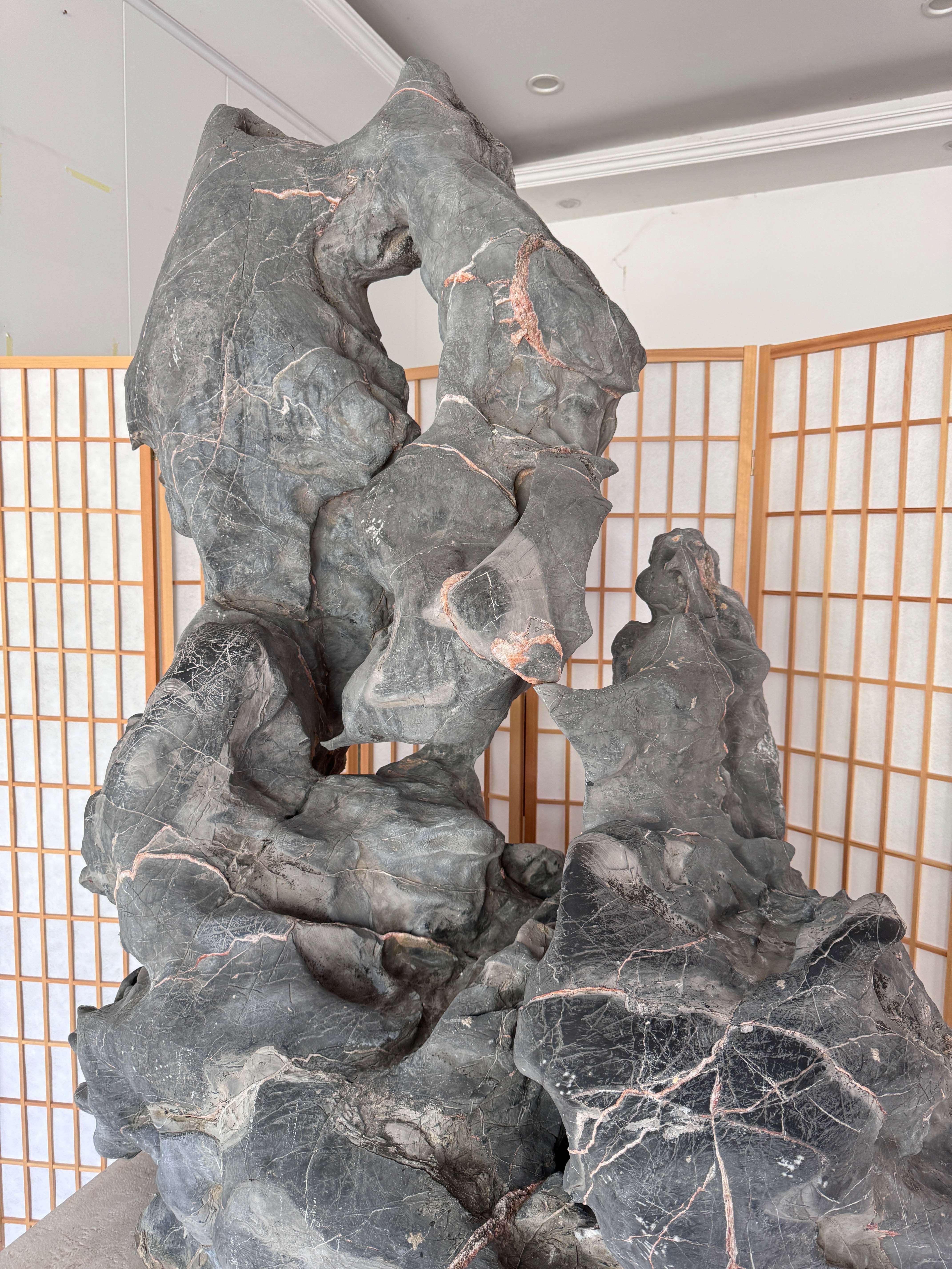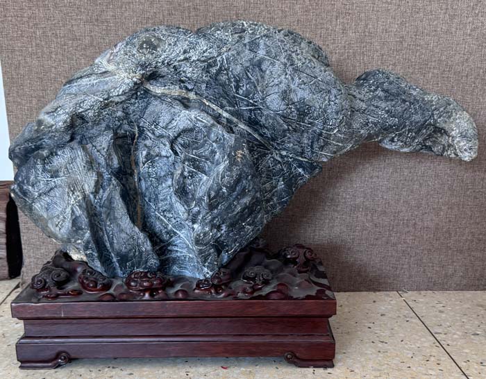 灵璧石·「象山」 一、石种与产地 石种:灵璧青石·象山纹老坑种;产安徽灵璧渔沟镇象山矿脉,为震旦纪海相硅质灰岩,富含石英、绢云母,质地细腻坚致,叩之若古寺木鱼,低沉悠长,属灵璧石中稀见的“青黛