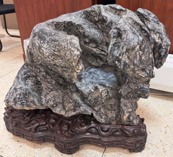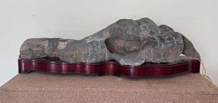 一、石种与产地 石种:灵璧石·龙鳞青黛种;产地安徽灵璧县朝阳镇深岩坑口,生成于七亿年前海相碳酸盐与硅质岩互层,富含铁质与微晶石英,质地缜密,叩之如编磬余韵。 二、题名与意象 “祥龙石”以龙形
