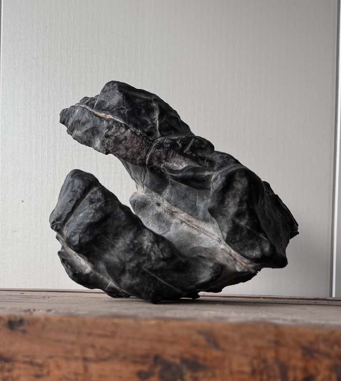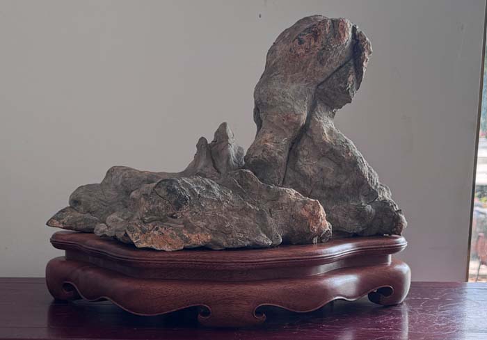 灵璧石·「拙石」 一、石种与产地 石种:灵璧石·拙石纹青石;产自中国安徽省灵璧县,形成于震旦纪海相沉积,富含铁质和微晶石英,质地细腻坚硬,叩之有声,为灵璧石中独特的象形石。 二、题名与意象
