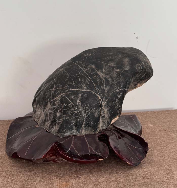 灵璧石·「金蟾」 一、石种与产地 石种:灵璧石·青黛金蟾纹;产自安徽灵璧县朝阳镇,形成于震旦纪海相沉积,富含铁质和微晶石英,质地细腻,叩之有声,为灵璧石中象形石之上品。 二、题名与意象 以