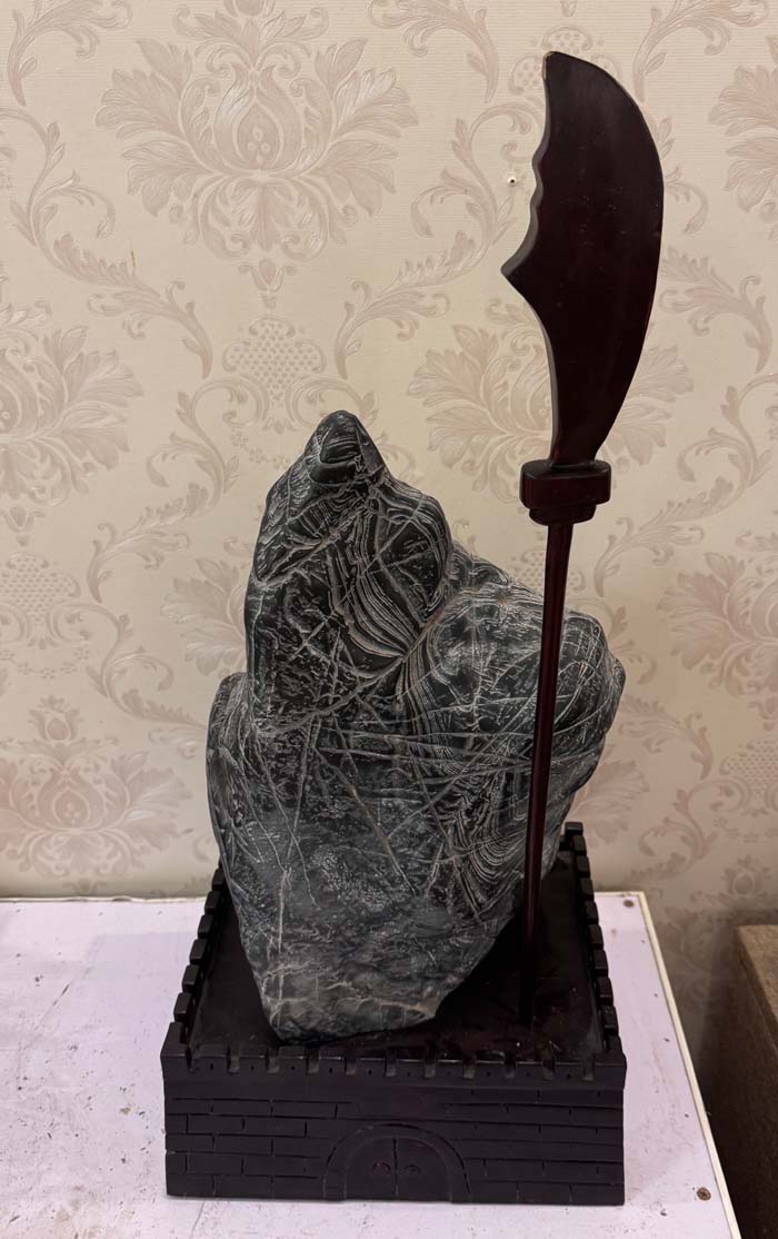 一、石种与产地 石种:灵璧石·关公纹青玉;产自安徽灵璧县渔沟镇,形成于震旦纪海相沉积,富含铁质和微晶石英,质地细腻,叩之有声,为灵璧石中象形石之上品。 二、题名与意象 以三国名将关羽为题,取