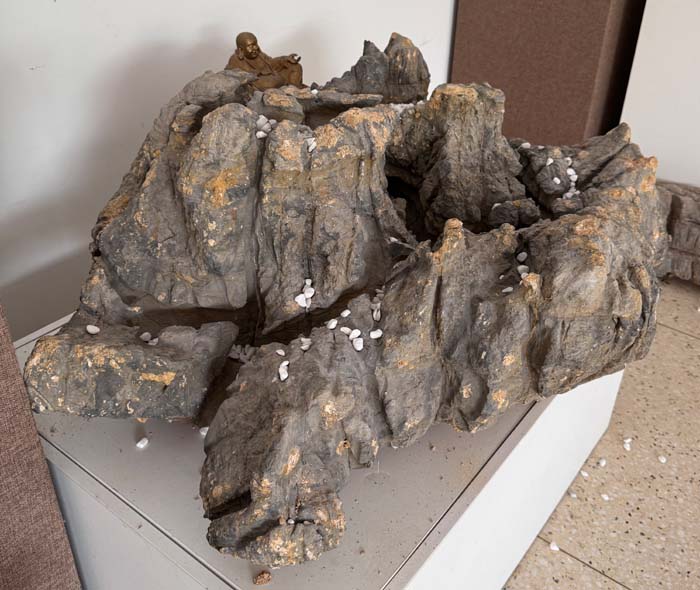 灵璧石·「莲花圣境」 一、石种与产地 石种:灵璧石·莲花纹青石;产自中国安徽省灵璧县,形成于震旦纪海相沉积,富含铁质和微晶石英,质地细腻坚硬,叩之有声,为灵璧石中稀有的象形石。 二、题名与意
