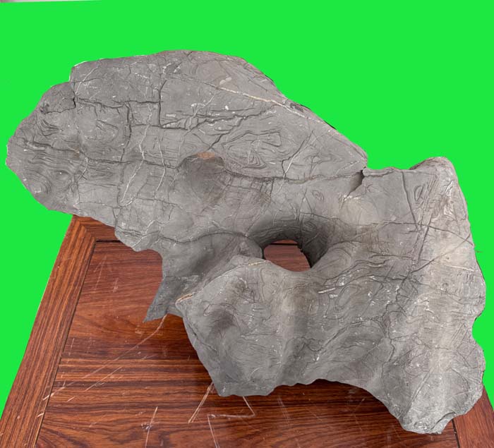 灵璧石·「纹韵千秋」 一、石种与产地 石种:灵璧石·纹韵青石;产自中国安徽省灵璧县,形成于震旦纪海相沉积,富含铁质和微晶石英,质地细腻坚硬,叩之有声,为灵璧石中以纹理著称的珍品。 二、题名与